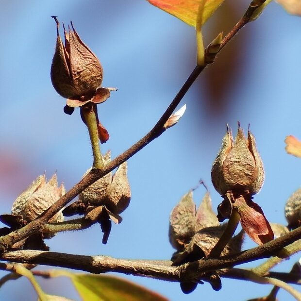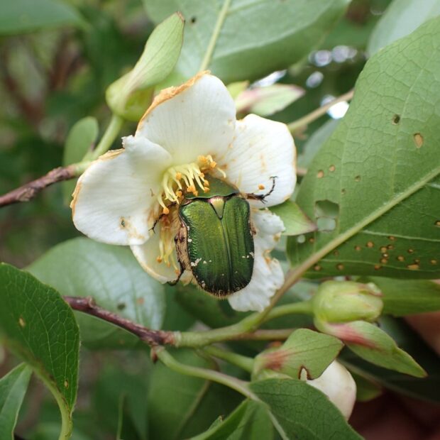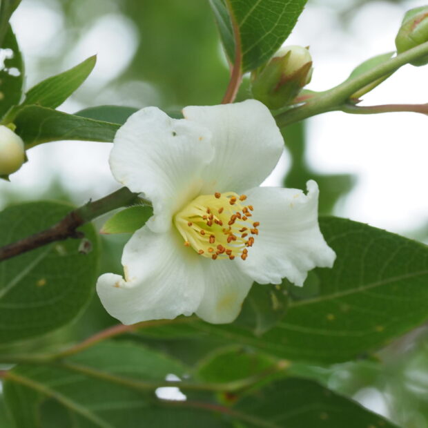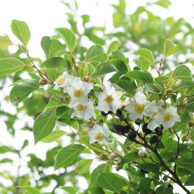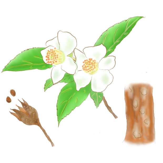 樹皮や春の新緑、 白くて小さなツバキのような花、 秋の紅葉、 どれも美しく庭木として人気のあります。