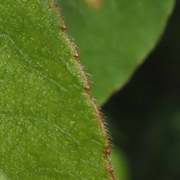先が鋭くとがり、 縁にギザギザがあります。 葉の周りと裏面の脈状に細かい毛が生え、 触るとフワッとした感じがします。