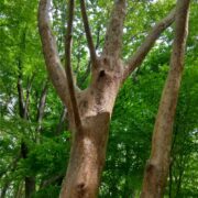 住宅では華奢な姿で植えられていますが、 ヒメシャラは野生児のように山でのびのび成長します。 樹皮は薄い皮がちりちりむけていて、 まるで日に焼けて皮がむけている子どもの背中のようです。 都会に連れてこられ、 元気がなくなるものが多く、 アニメのハイジのようなイメージを抱いてしまいます。