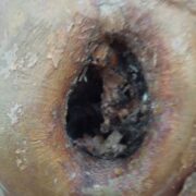 赤っぽい色です。 薄くはがれてきてなめらか。 色んな色の斑紋(はんもん)があるように見えます。
