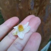 花は白色です。 ツバキの花を小さくしたような形をしています。