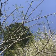 太い枝に、 小さな2つの芽がついています。 葉痕は芽よりかなり大きく、 笑っているような、 寝ているようなお顔があります。