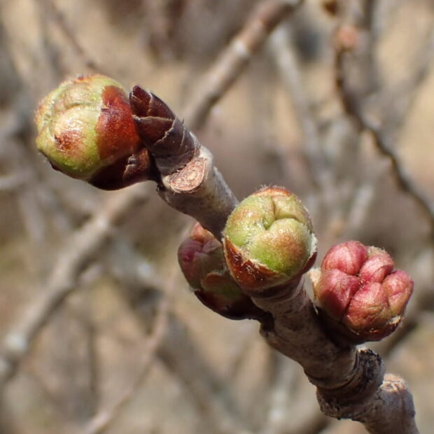 褐色で艶があります。 葉芽は細めでとがり、 花芽はぷっくりと丸みがあります。 葉痕の維管束痕は3つでお顔に見えます。