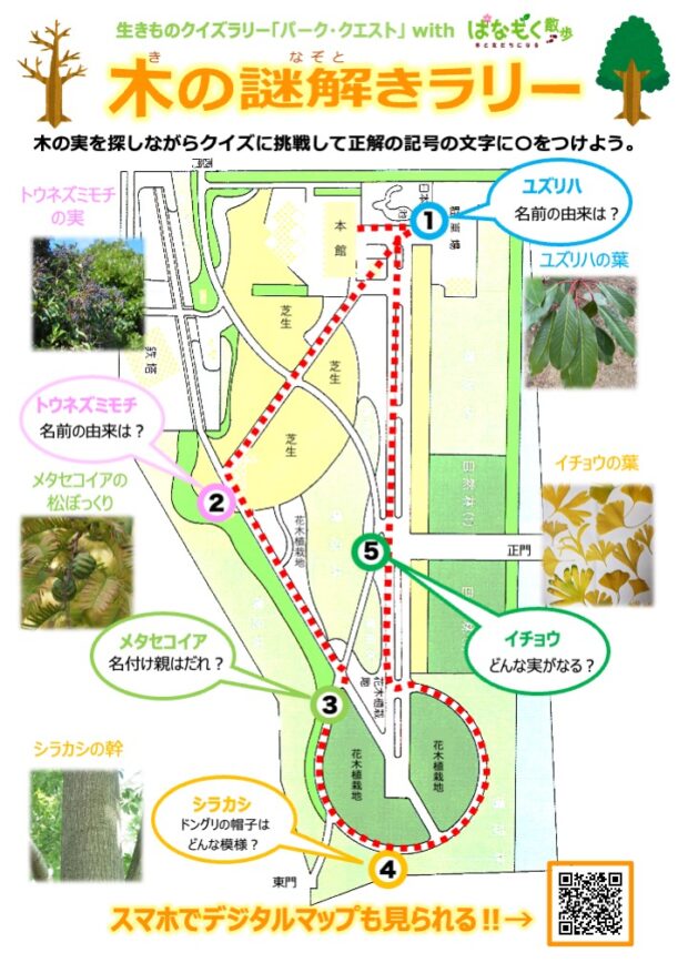 園内の木々から出される問題に答えて、 園内にいる謎の生き物の名前を見つけ出そう。