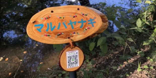 スマホで「はなもく散歩」樹名板のQRコードを読むだけで木の音声ガイドやクイズなどが楽しめます。
