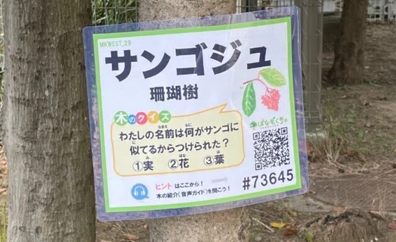 幕張西小学校には36種類64枚の「はなもく散歩」樹名板が設置されています。 (マップの木のある場所)