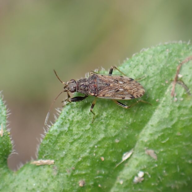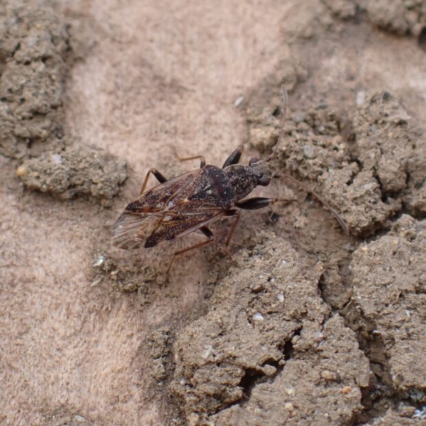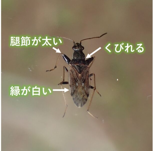 ヒョウタンナガカメムシの仲間。 草地で見られ、 夜は明かりにやって来ます。 体は褐色で、 前あしの腿節が太く、 胸がくびれています。 似ている種が多く識別には注意が必要。 キベリヒョウタンナガカメムシに似ていますが、 本種は、 前ばねに直立した長毛がなく、 中あし腿節の黒い部分が広いです。
