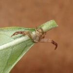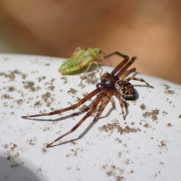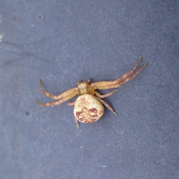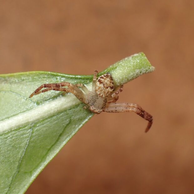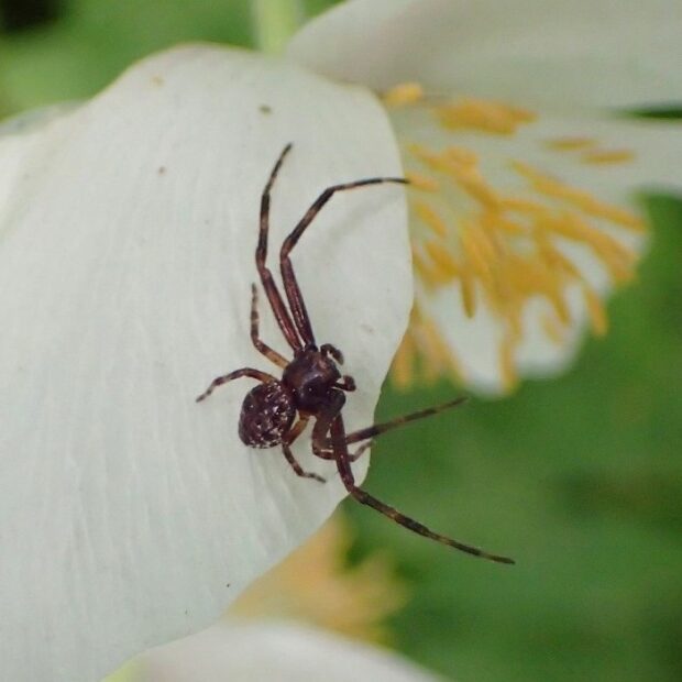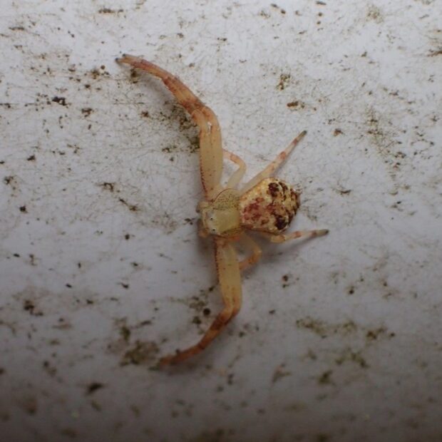 カニグモの仲間。 平地~山地に広く生息し、 花に潜み待ち伏せをして、 獲物を捕えます。 腹部の色は、 黄色・黄白色・淡桃色など変異がありいろいろです。 名前はクモの研究者である熊田憲一氏に因みます。