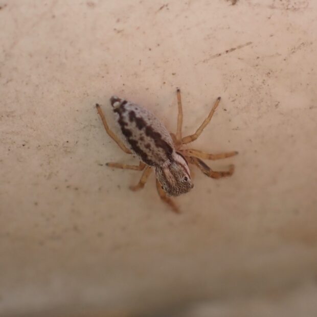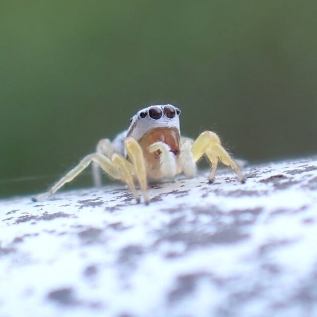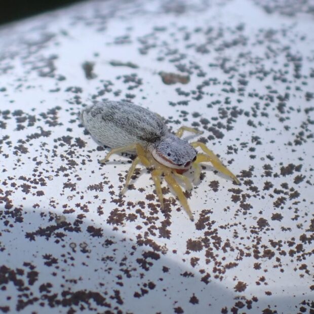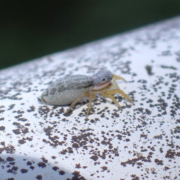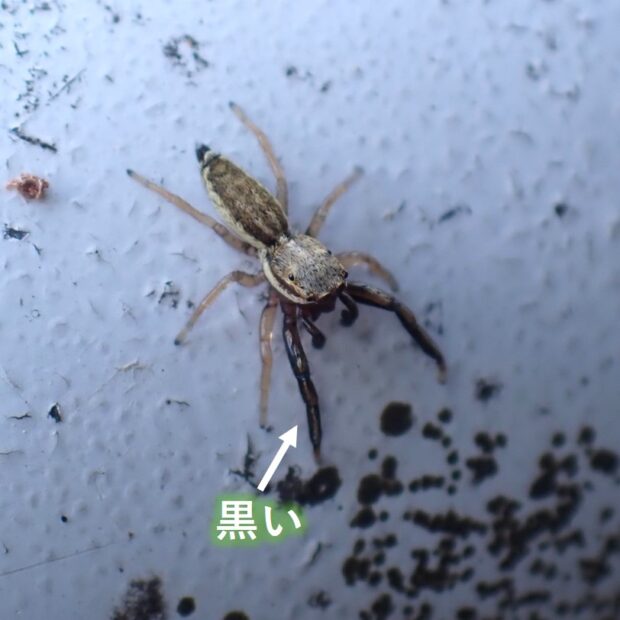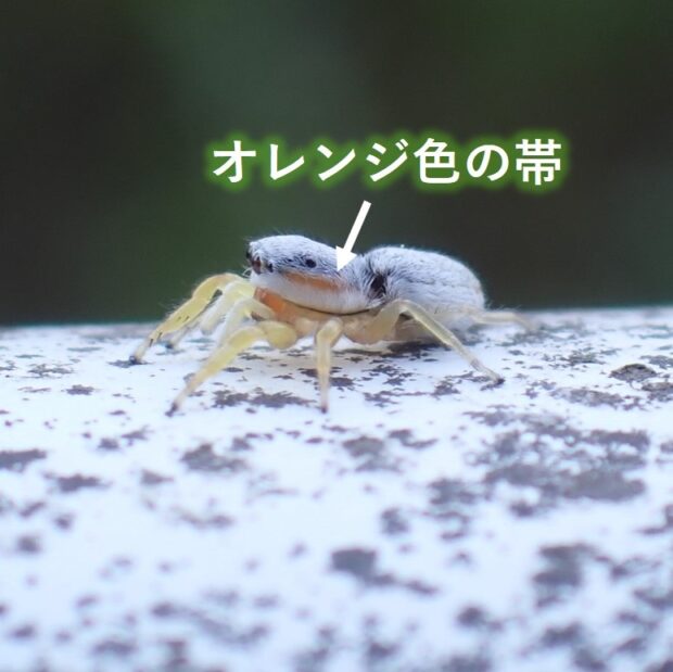 ハエトリグモの仲間。 雑木林の木や手すりなどで見られます。 メスは青白い体に黄色いあし、 オスは第1脚が黒く、 茶色の帯があります。 クモマは雲の間という意味です。