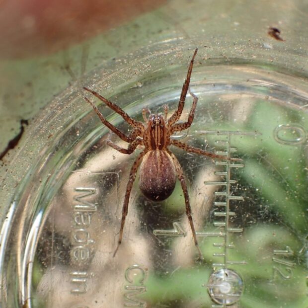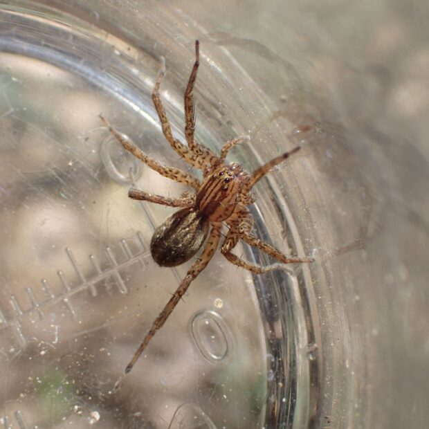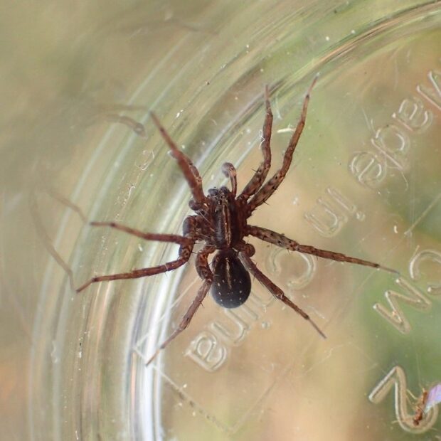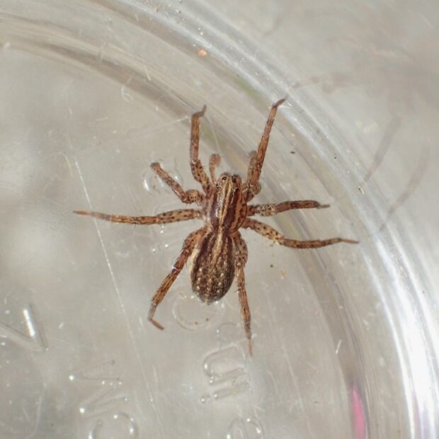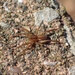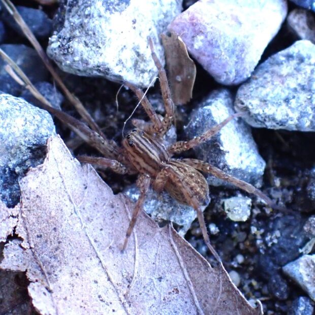 コモリグモ科の仲間。 名前のとおり、 池、 川、 田んぼ周辺の湿地で見られます。 体は茶色で、 頭胸部に黒い筋があります。 湿地を歩き回って獲物を探します。