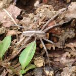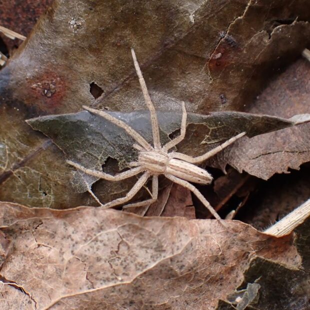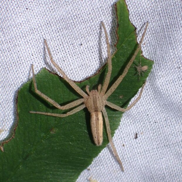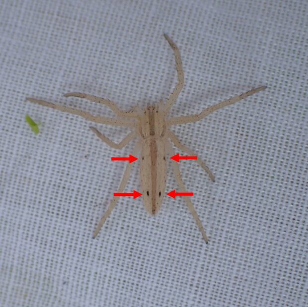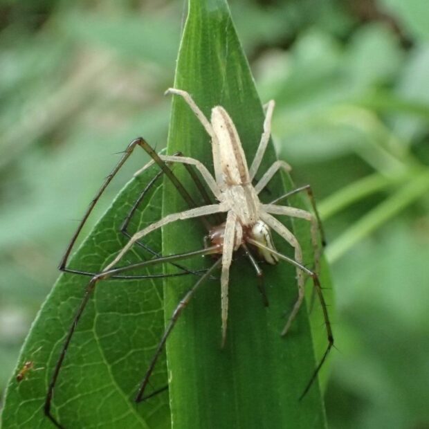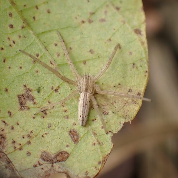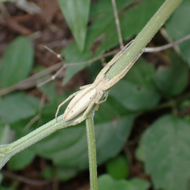 エビグモ科の仲間。 平地~山地まで広く生息し、 水田や樹林地周辺で見られます。 草や木の葉の上で待ち伏せをして、 獲物を捕えます。 体は白っぽく、 腹部に4個の黒点がありますが、 前方の黒点が目立たないものもいます。 名前は海のシャコからつけられました。