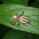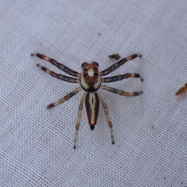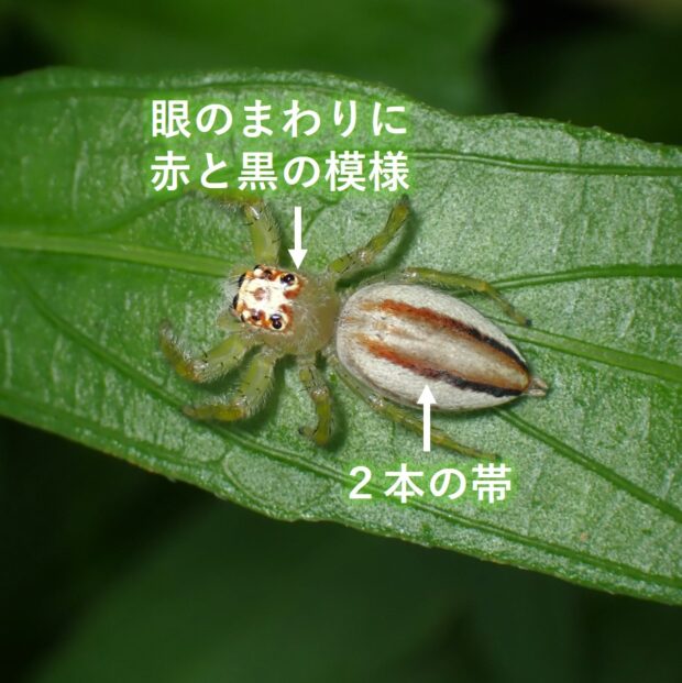 大型のハエトリグモ。 南西諸島の樹林地で見られます。 メスは眼の周囲の赤と黒の模様が目立ち、 腹部には2本のたて筋があります。 オスは黒っぽく、 頭胸部の真ん中に白っぽい模様があります。