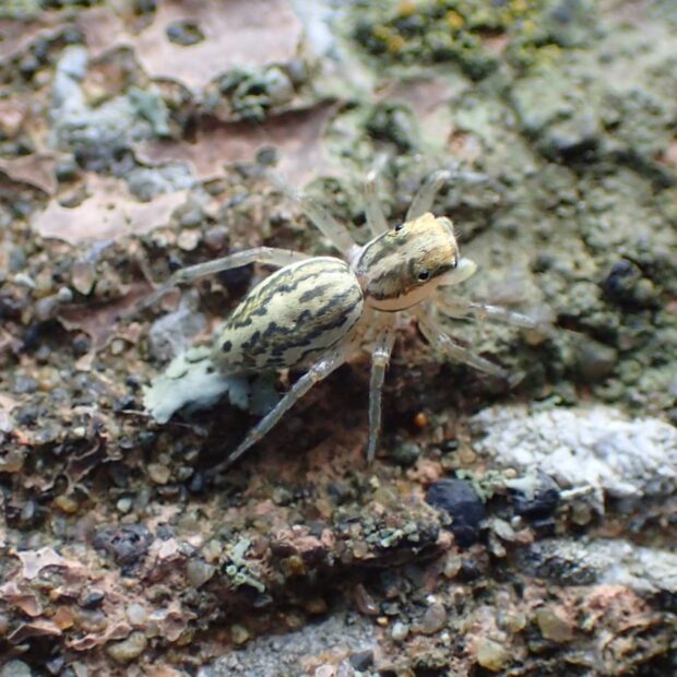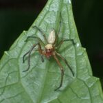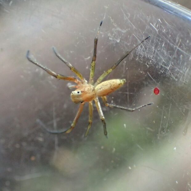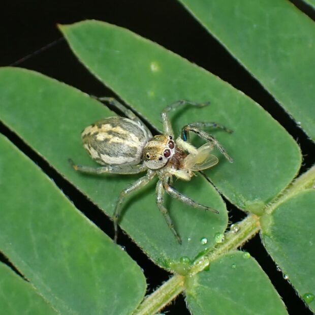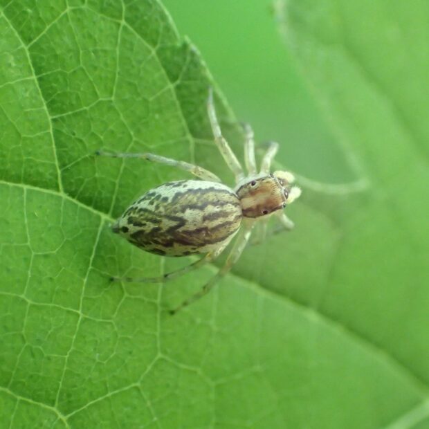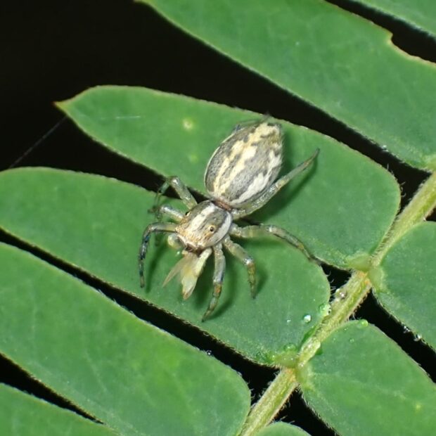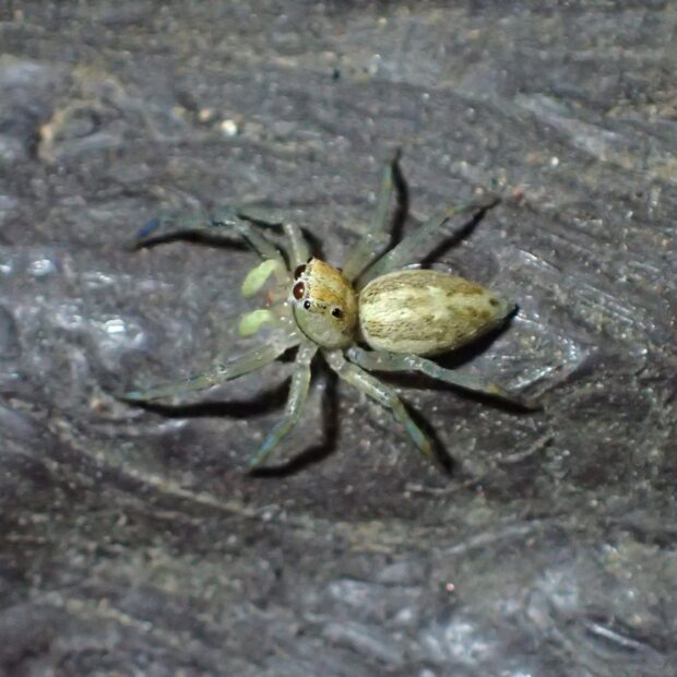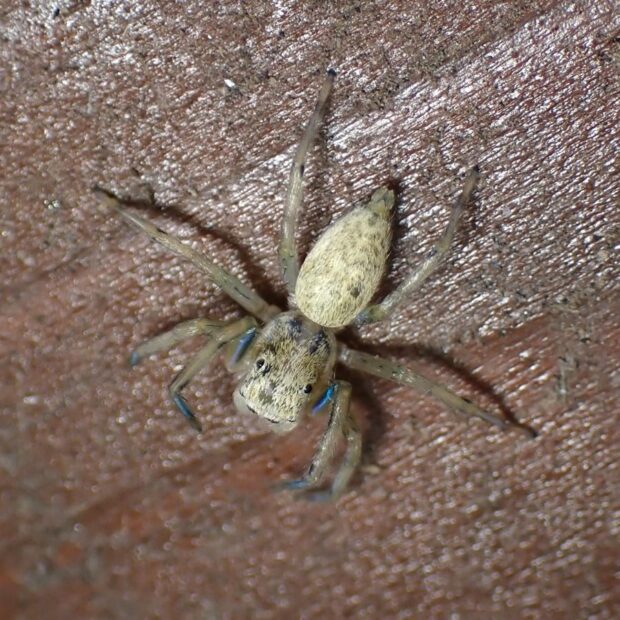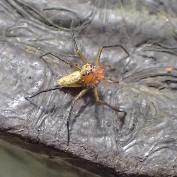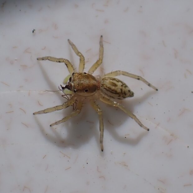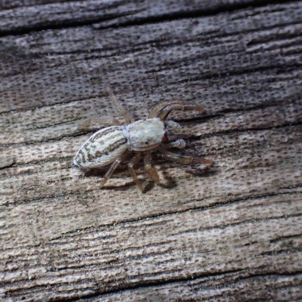 ハエトリグモの仲間。 都市公園~山地に生息し、 樹林地の草や木の上で見られます。 メスは淡黄色の体に褐色の模様があります。 オスはあしがとても長くビックリ!