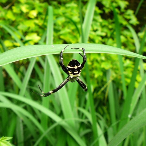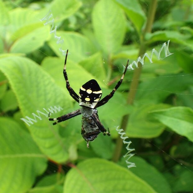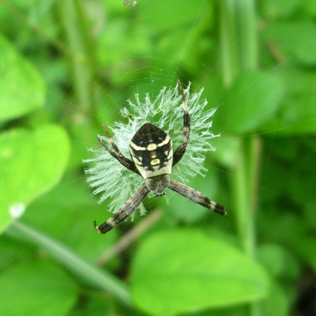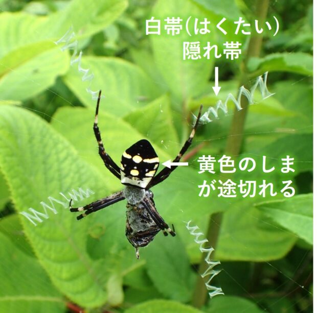 コガネグモの仲間。 平地~山地に生息し、 草地で見られます。 垂直の円網を張り、 X字状の白帯(隠れ帯ともいう)をつけます。 メスの腹部の黄色のしま模様は分断しています。 オスは小さく黒褐色。