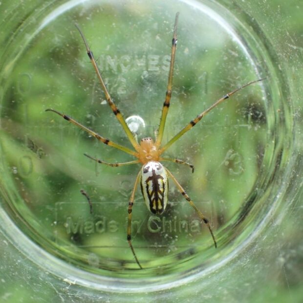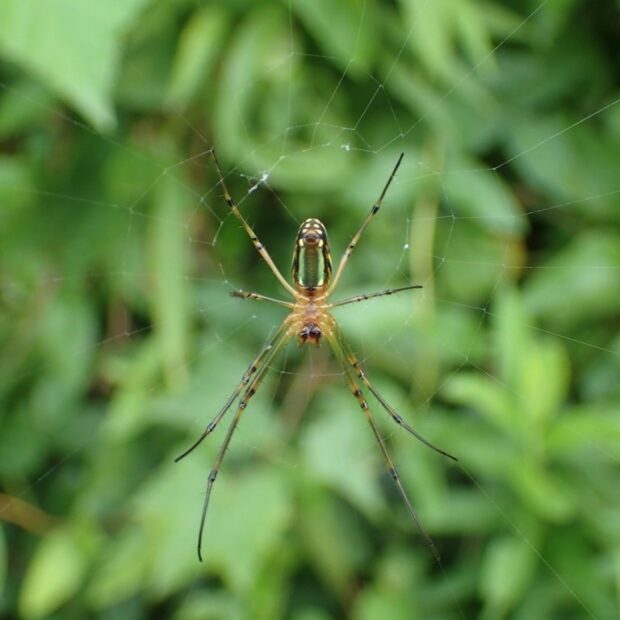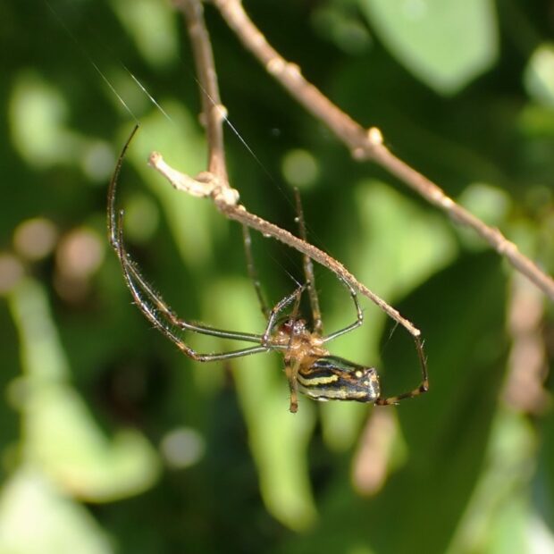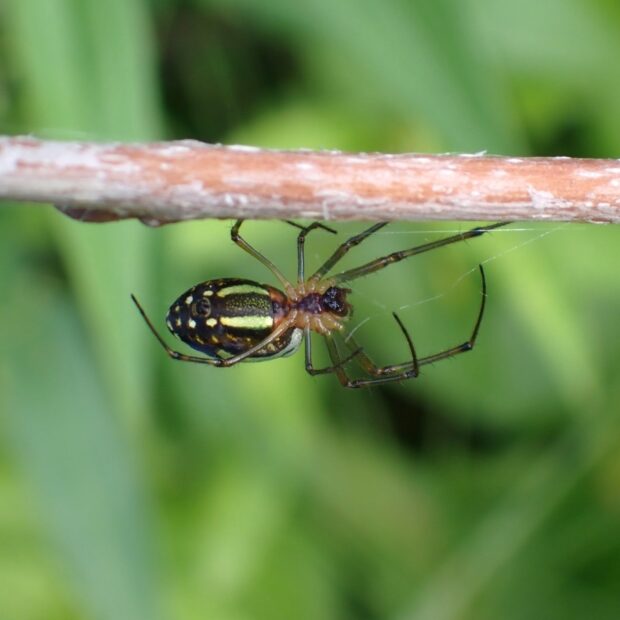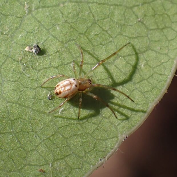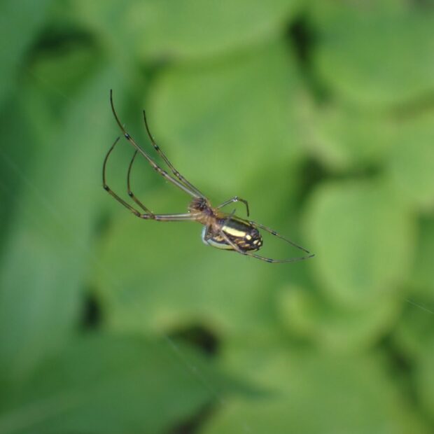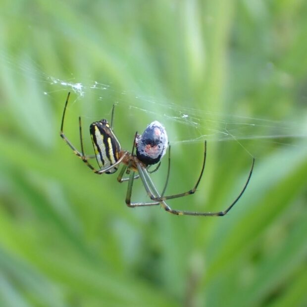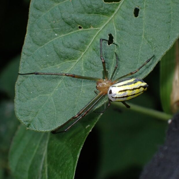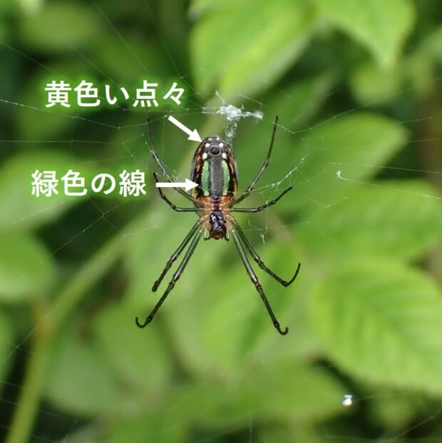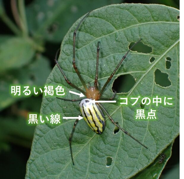 アシナガグモの仲間。 メスは腹部の両肩にコブがあり、 その中に黒点があるのが特徴。 平地~山地に生息し、 草地で見られます。 草の間に斜めに傾いた円網を張ります。 北上している南方系のクモ。