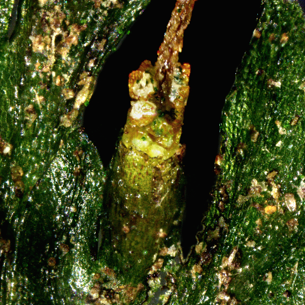 古い葉柄基部に覆われ、 直接は見えない。