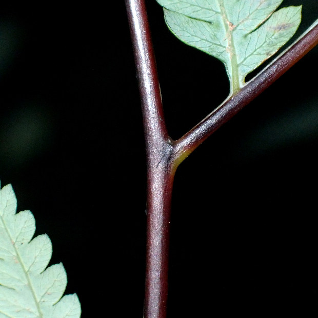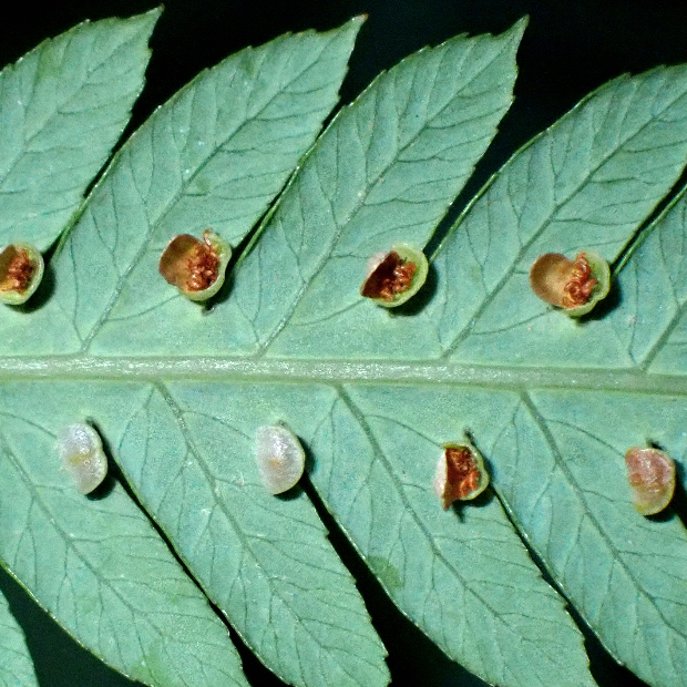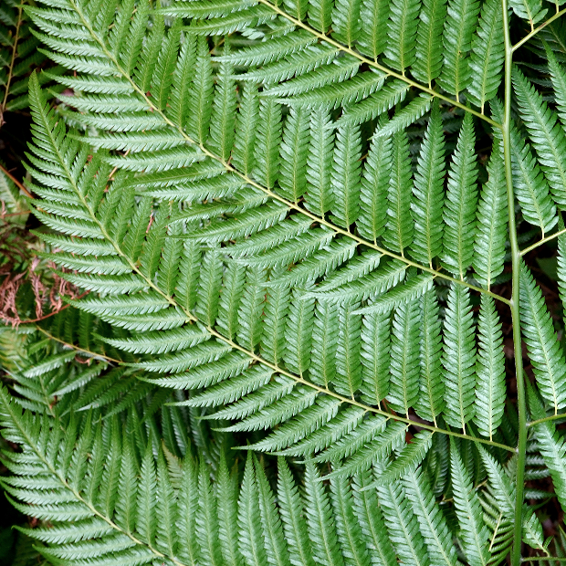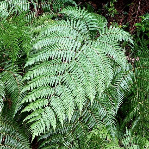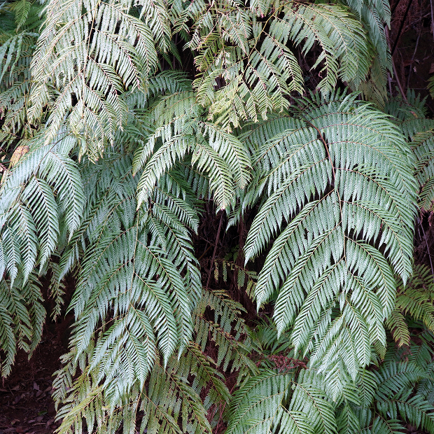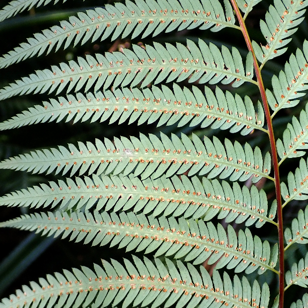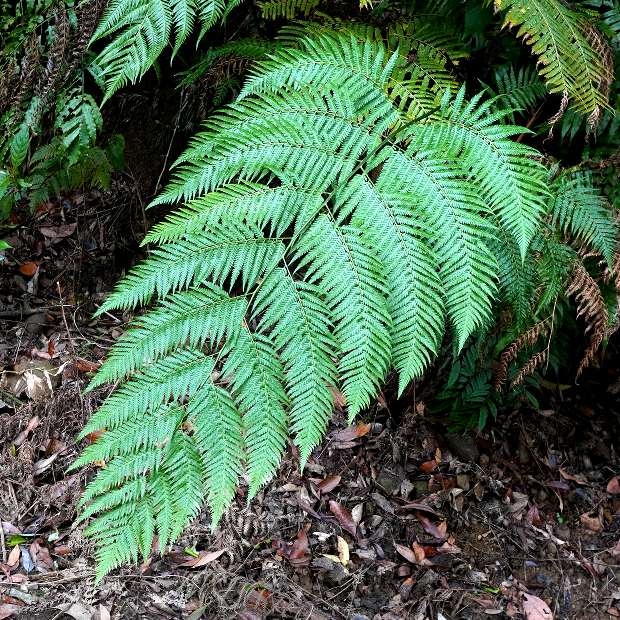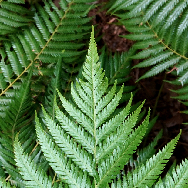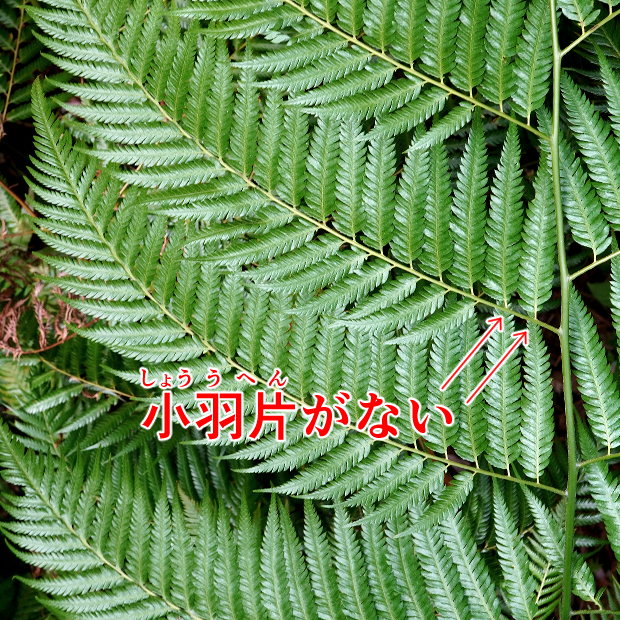 亜熱帯に分布する大きなシダ。 葉はツルっとした質感で、 細く尖るように切れ込んでいて、 裏が白っぽいです。 葉裏につく胞子のう群を覆う包膜は二枚貝状をしていて、 葉柄基部には赤茶色っぽい毛をびっしりつけます。 名前のタカは高く育つことに由来しますが、 ヘゴのような幹は発達させません。 また、 ワラビはシダの総称的意味があり、 山菜で有名なあのワラビと分類的に大きく異なります。
