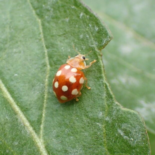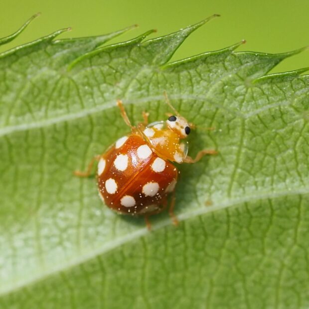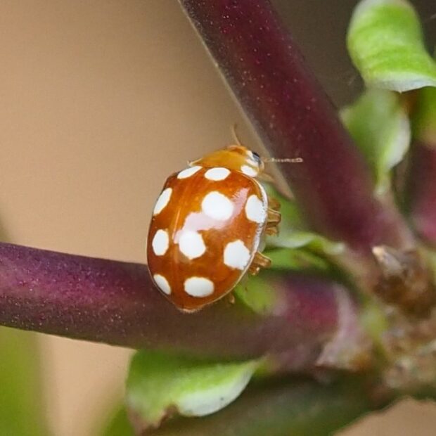 オレンジ色の上翅に白い紋が並ぶテントウムシ。 白色の紋は1-2-2-1に並びます。 シロホシテントウは、 2019年にフクダシロホシテントウとサイトウシロホシテントウの2種になりました。 他にも似ているシロホシテントウがいることから、 識別には交尾器を調べる必要があります。