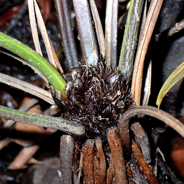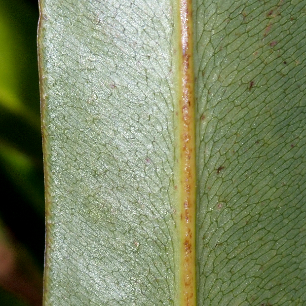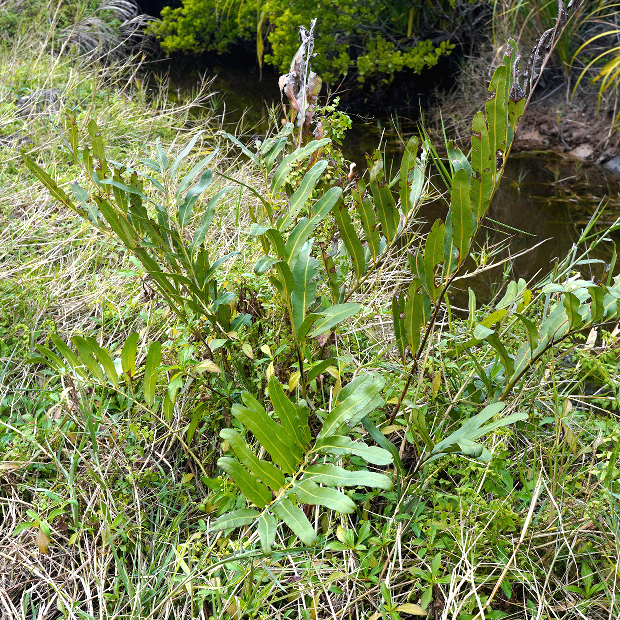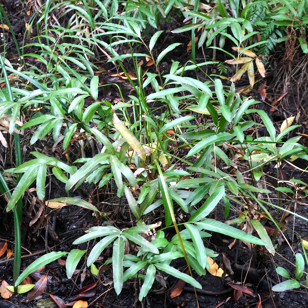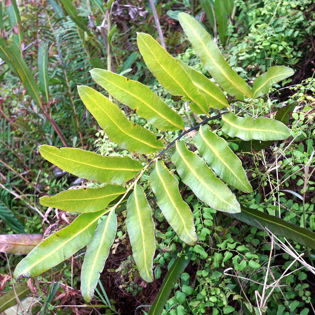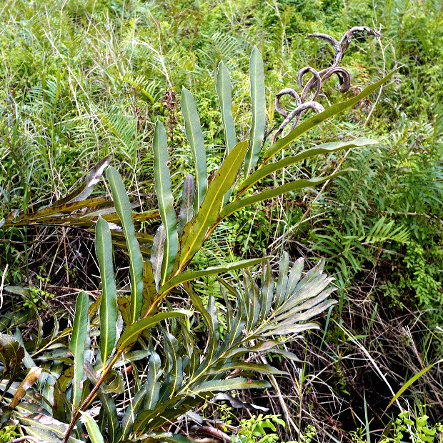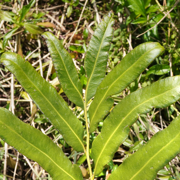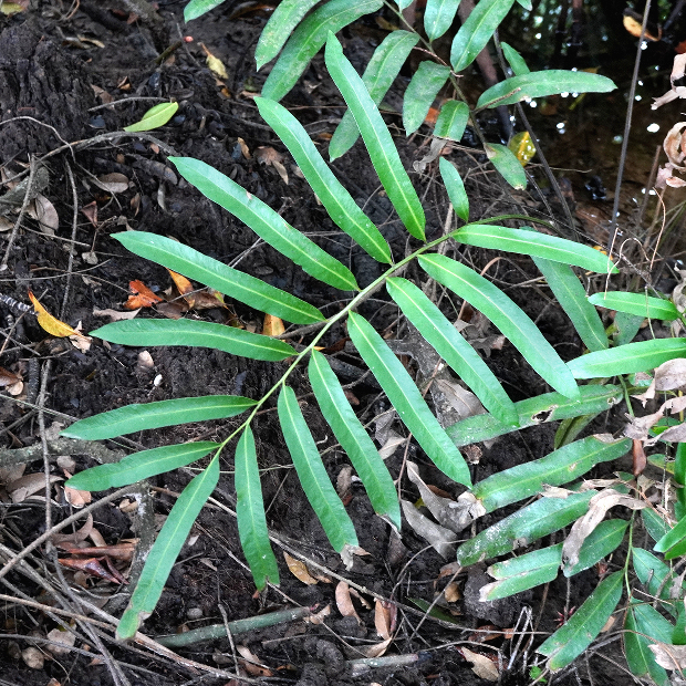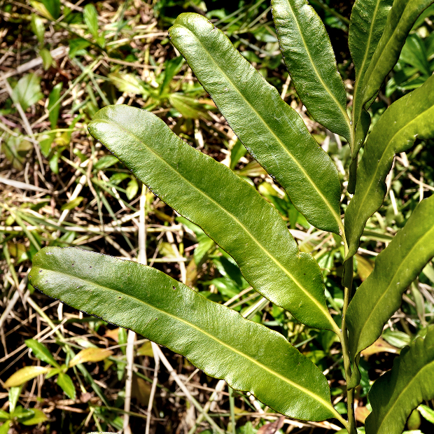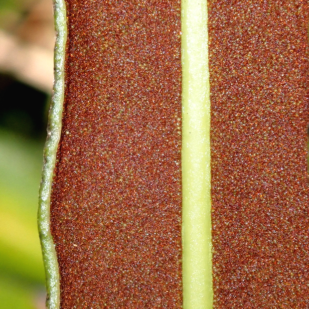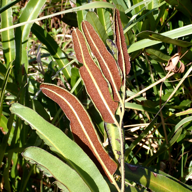 のっぺりとした厚い葉を出す大きめのシダ。 シダとしては珍しく、 海水の入るマングローブの湿地に生えます。 葉先近くの羽片裏面には、 全体が赤茶色っぽくなるように、 胞子のうをびっしりつけます。