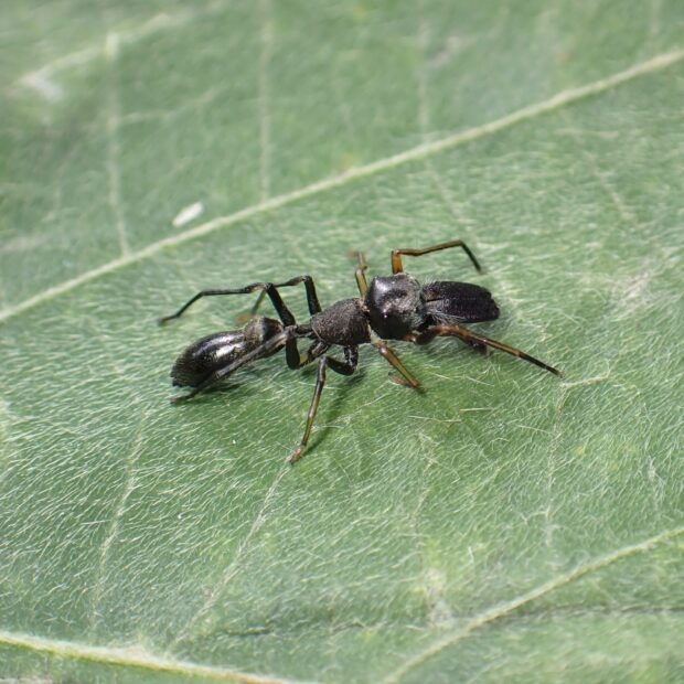 ハエトリグモ科アリグモの仲間。 草はらや樹林地の草木の葉上、 人家の外壁などいろいろな環境に生息しています。 赤みのない黒っぽいものも見られます。