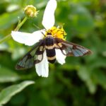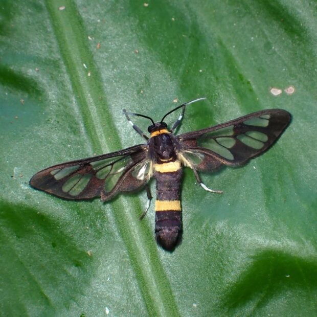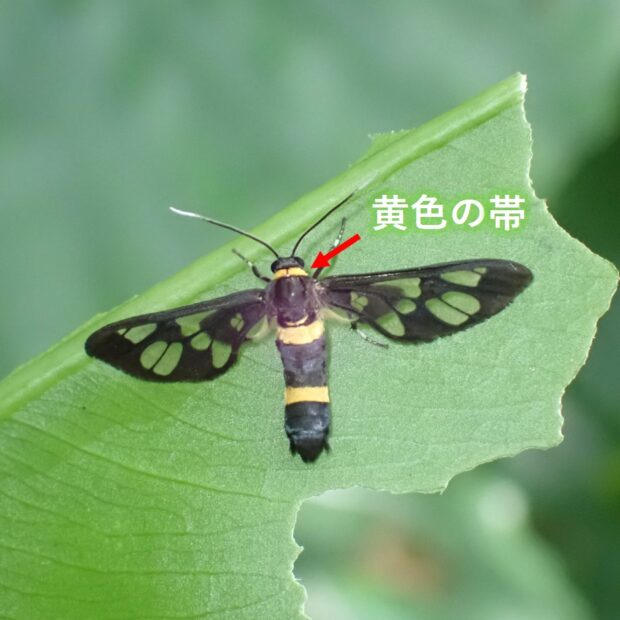 ヒトリガ科カノコガの仲間。 昼行性。 透けたはねをもち、 黒い腹部にある2本の黄色い帯が目立ちます。 2004年に与那国島で発見されて以降、 急激に沖縄本島などへ分布を広げています。