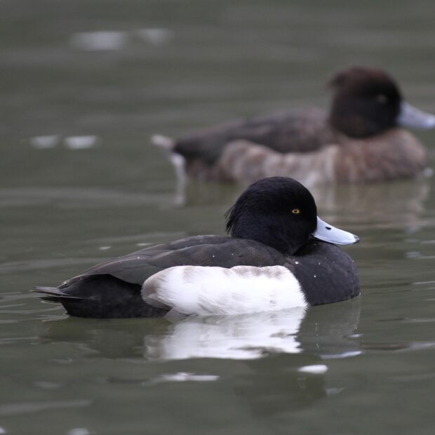 オスの体色は黒色で、 腹部が白色です。 メスは、 全体的に黒褐色です。 くちばしは雌雄ともに青灰色で、 メスはくちばしの基部が白色です。