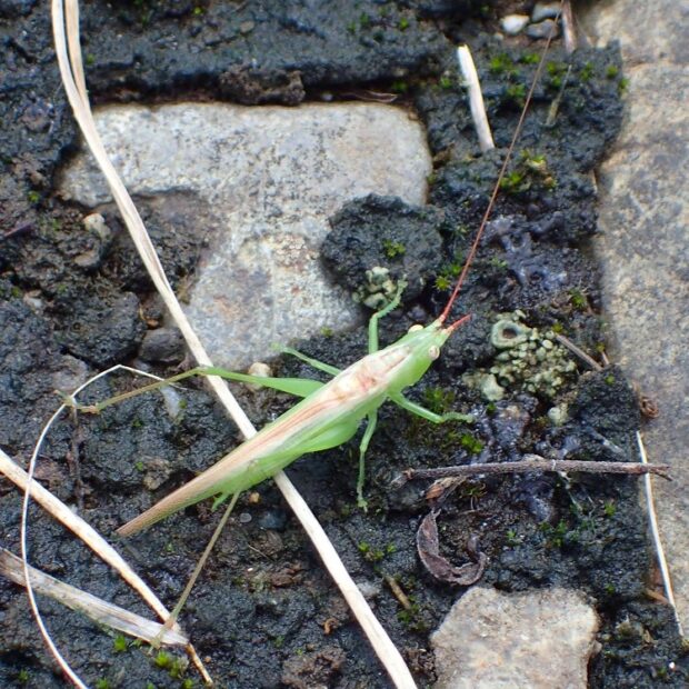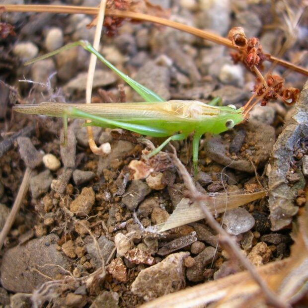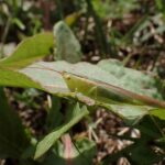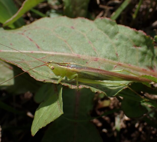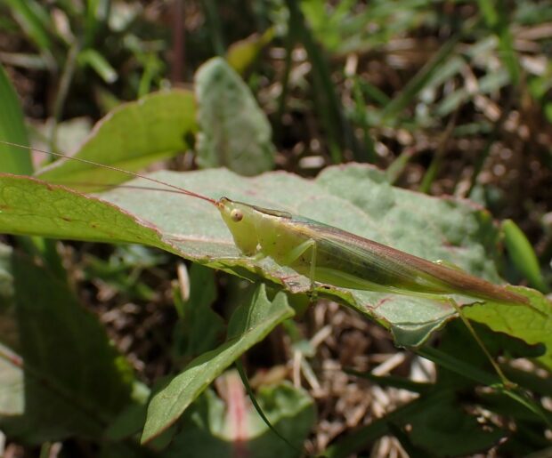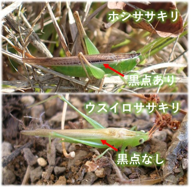 ウスイロササキリは前ばねに黒点がなく、 触角が赤っぽいです。