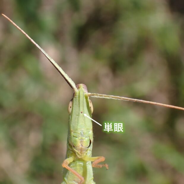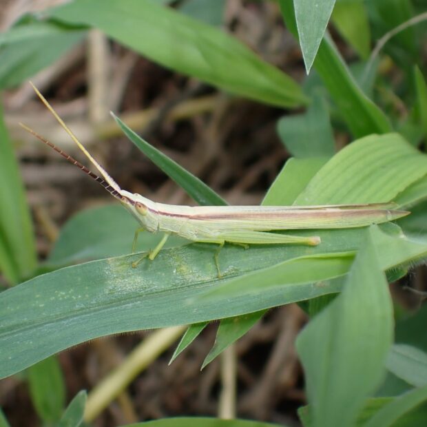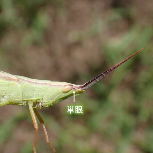 バッタの仲間。 日当たりのよいイネ科植物が生える草地で見られます。 体は緑色のものが多いですが、 褐色のものもいます。 後あしは短く、 止まっているとき体にそわせています。 飛翔力は弱く、 飛ぶときにチキチキという音は立てません。