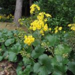 葉は厚く光沢がありフキに似ていることから、 艶蕗(つやぶき)がなまってツワブキという名前になったと言われています。 他の花が終わった頃に黄色の花をつけます。