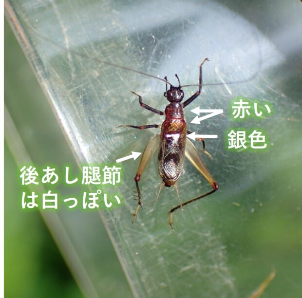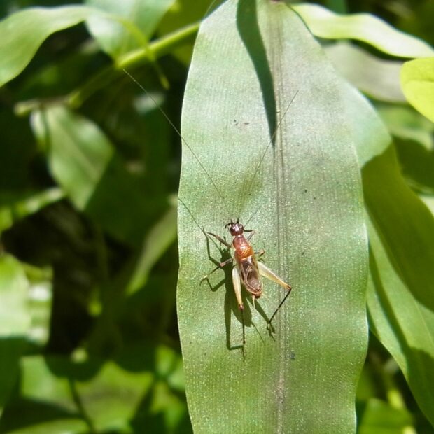 ヒバリモドキ科の仲間。 うす暗い林や林縁の下草で見られます。 赤みのある胸部が特徴。 オスは「ギ・ギ・ギ」と不規則に鳴きます。