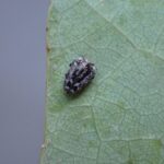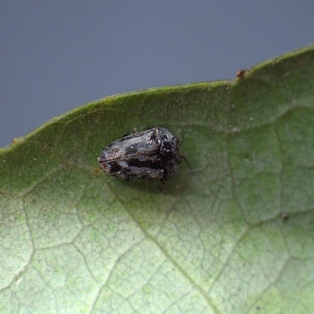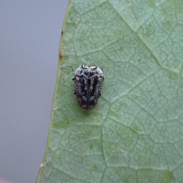 早春から見られるヒラタチビタマムシの仲間。 黒い体に灰白色の微毛が生え、 V字模様が特徴的。 チビタマムシの仲間は小さく、 似ていますが、 これは簡単に見分けることができます。