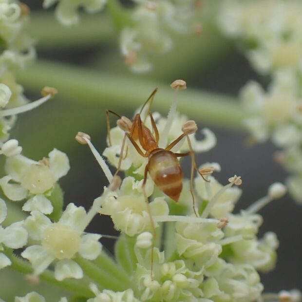触角とあしがとても長く、 スマートで透明感がある熱帯のアリ。 沖縄では、 街中、 草地などで普通に見ることができます。 世界中に分布を広げ、 侵略的外来種ワースト100に入っています。
