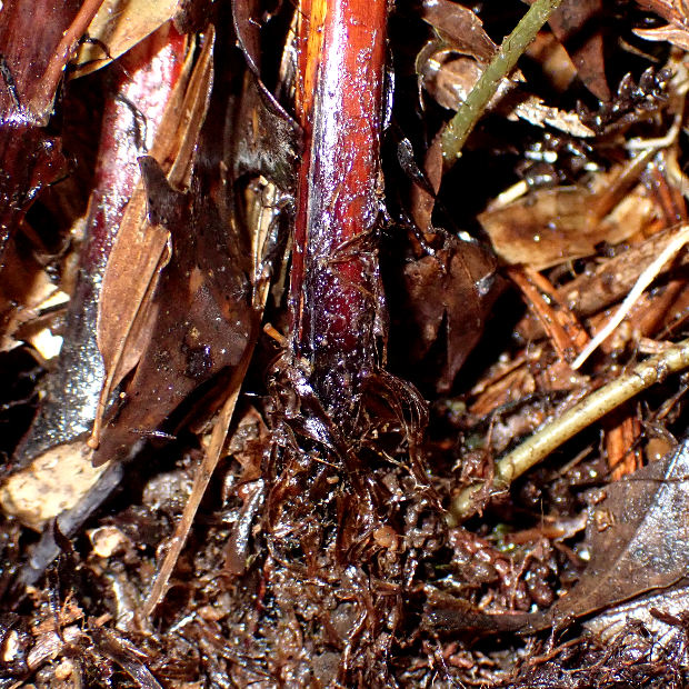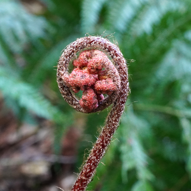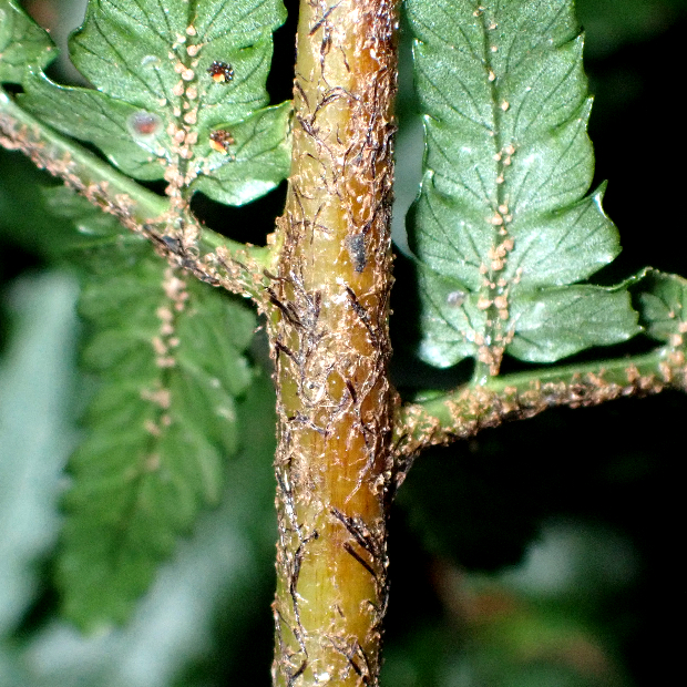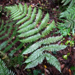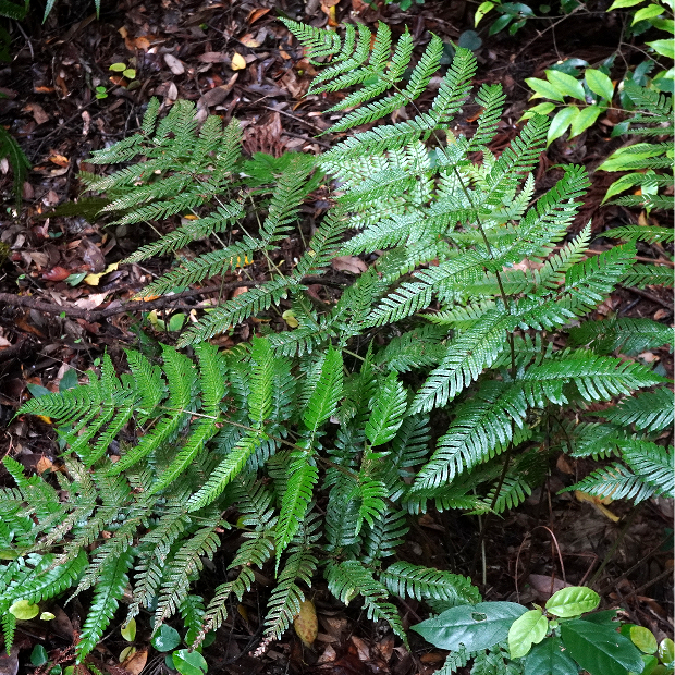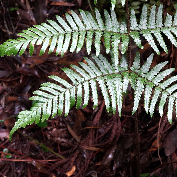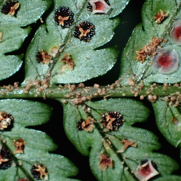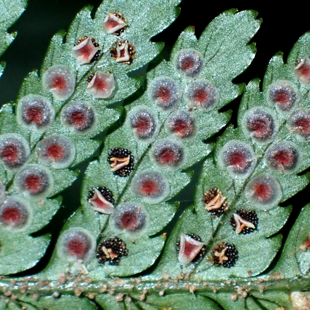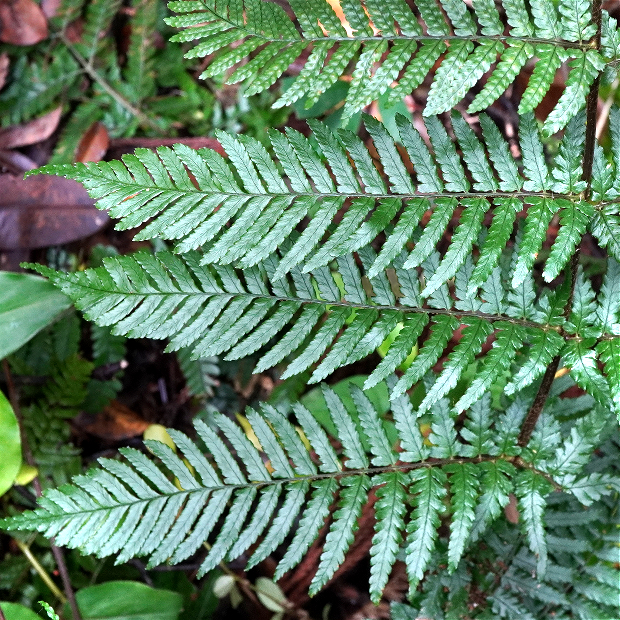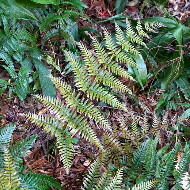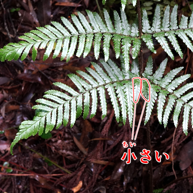 近年の研究でベニシダは、 大昔にハチジョウベニシダとマルバベニシダが交雑して生まれたと考えられています。 マルバベニシダは、 ベニシダよりも葉が厚くパリパリとした質感で、 小羽片に丸みがあるのが特徴です。 つまりハチジョウベニシダは、 ベニシダからこの特徴を抜いたものだと意識しておくと見当をつけやすいです。 ただし、 この両種は外見がほぼ同じのことがあり、 これだけですべての個体を見分けるのは困難だともいわれています。