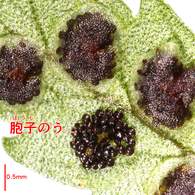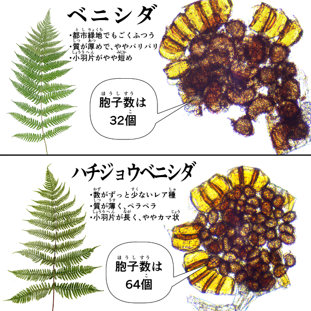 では、 どうすればしっかり見分けられるのかというと、 「胞子のう1個にできる胞子の数」を調べる必要があります。 ハチジョウベニシダは胞子を64個、 ベニシダは32個つくります。 ですが、 この胞子のうはとても小さく、 調べるには生物顕微鏡や専用のガラス板(プレパラート)など、 特別な道具が必要です。
