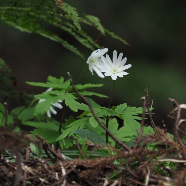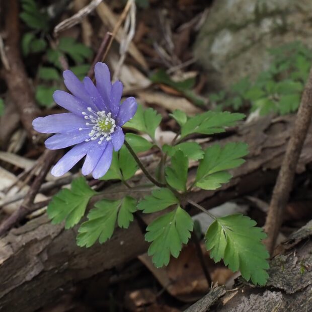 カタクリの花の時期に一緒に咲き、 キクザキイチゲは群落でみることが多い春植物です。