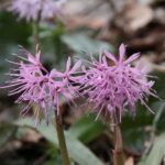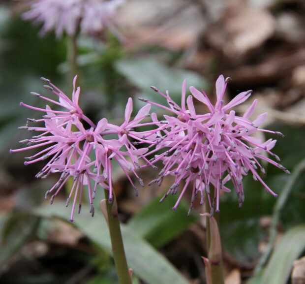 山沿いの谷筋や林野の湿った場所で見られます。 花の色は濃いピンク、 薄紅色、 白などで、 雪どけとともに見ることができる花です。 花が成熟すると茎が高くなります。