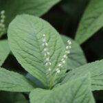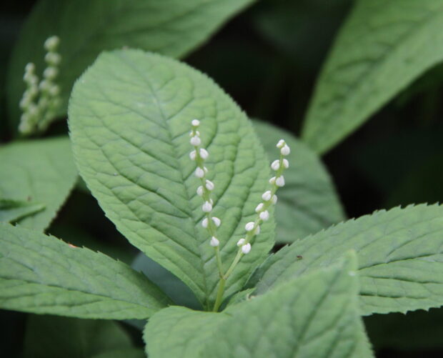 小さな花が棒状に付いた穂(ほ)が仲良く二つ並びます。 美しさとは程遠くて地味な花です。