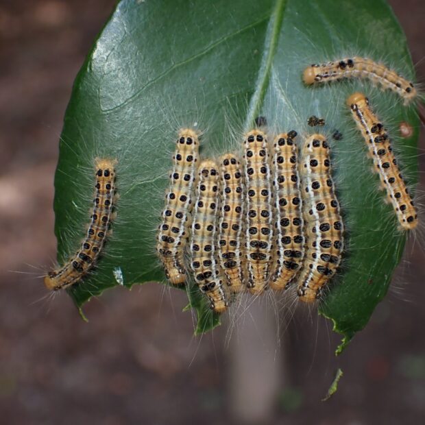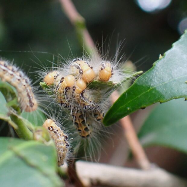 ツバキ科植物の葉っぱに食べあとや、 木の下にフンがあれば、 近づかないようにしましょう。 幼虫は葉の裏にもおり、 目に見えない細かな毒針毛が風で運ばれて、 肌に触れ、 かぶれることがあります。