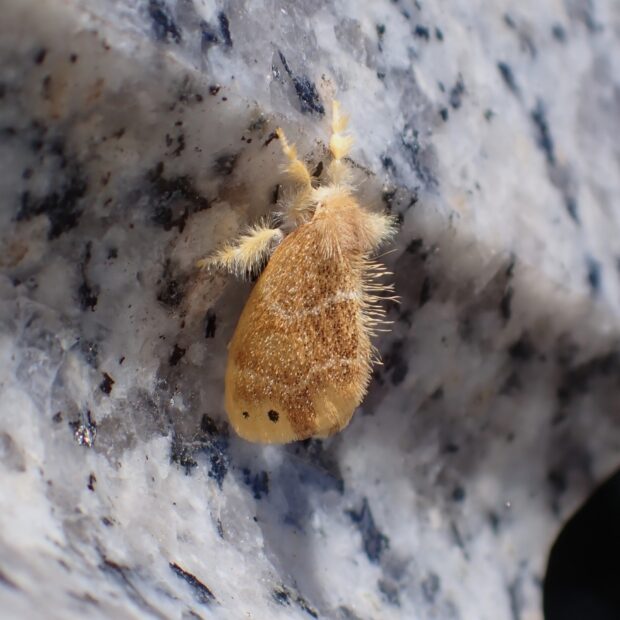 ドクガ科の仲間。 ツバキ、 サザンカ、 チャなどで、 春と秋の2回、 姿をあらわします。 成虫のはねの色は黄色~黒褐色とさまざまです。 幼虫には毒針毛(どくしんもう)という毒のある短い毛がたくさんあり、 その毒針毛がまゆ、 成虫、 卵とすべてに付着して受けつがれます。