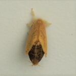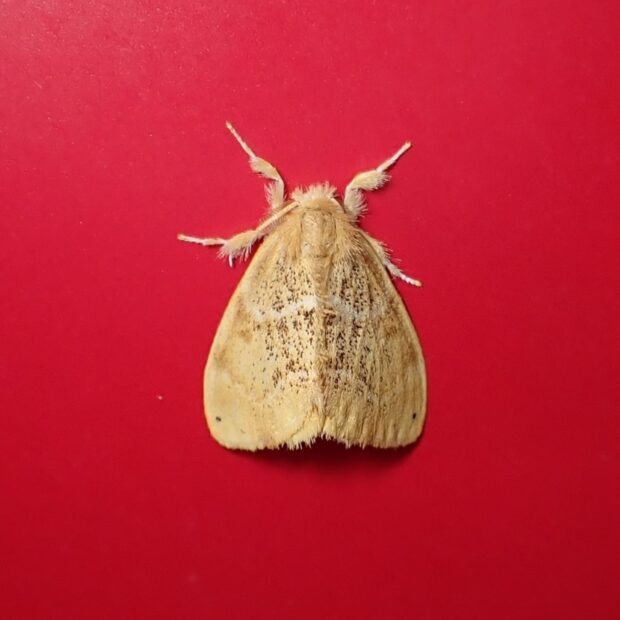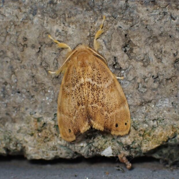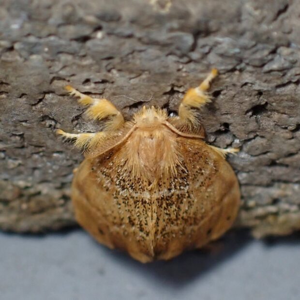 ドクガ科の仲間。 ツバキ、 サザンカ、 チャなどで、 春と秋の2回、 姿をあらわします。 成虫のはねの色は黄色~黒褐色とさまざまです。 幼虫には毒針毛(どくしんもう)という毒のある短い毛がたくさんあり、 その毒針毛がまゆ、 成虫、 卵とすべてに付着して受けつがれます。