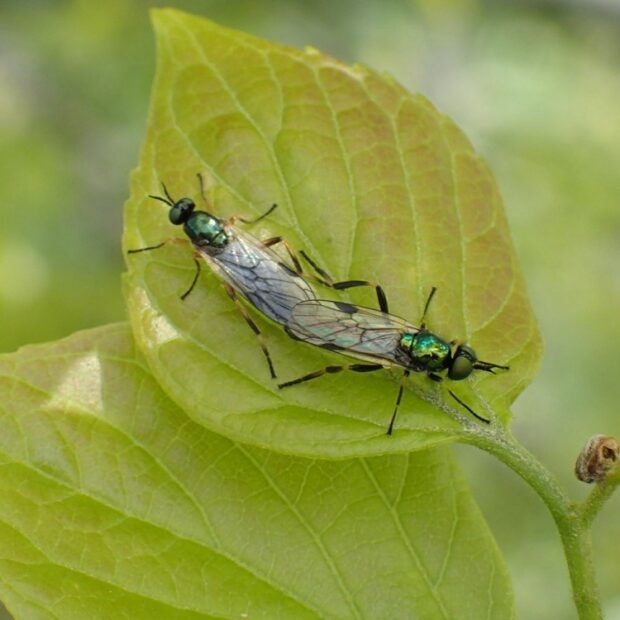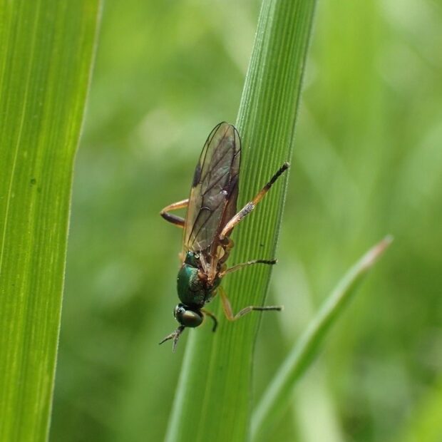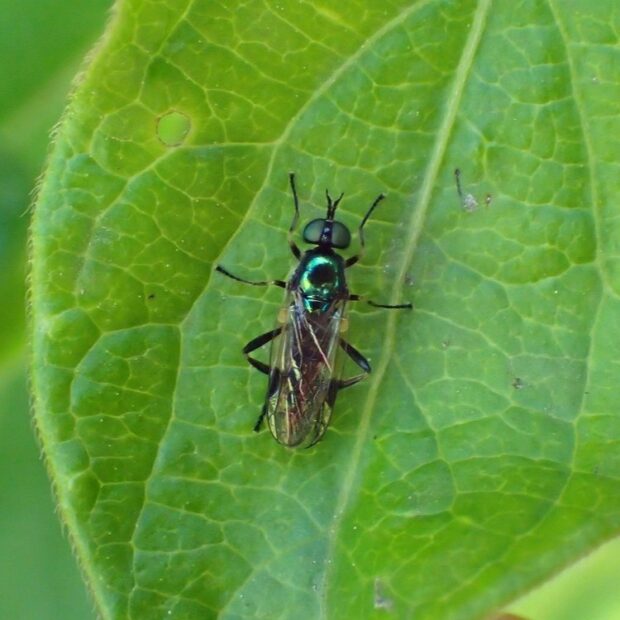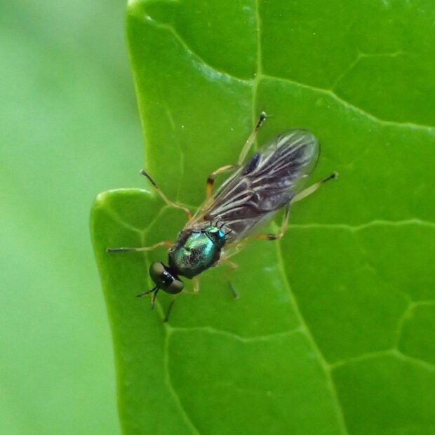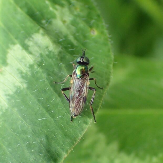 ミズアブ科の仲間。 胸は金属光沢のある緑色で、 ほっそりした小型のミズアブ。