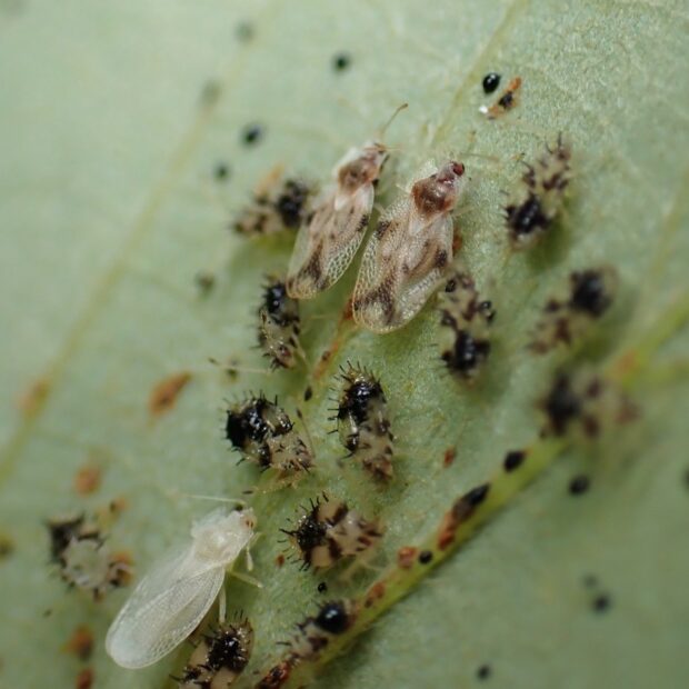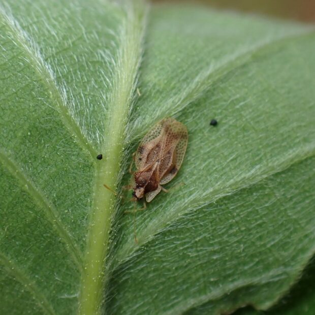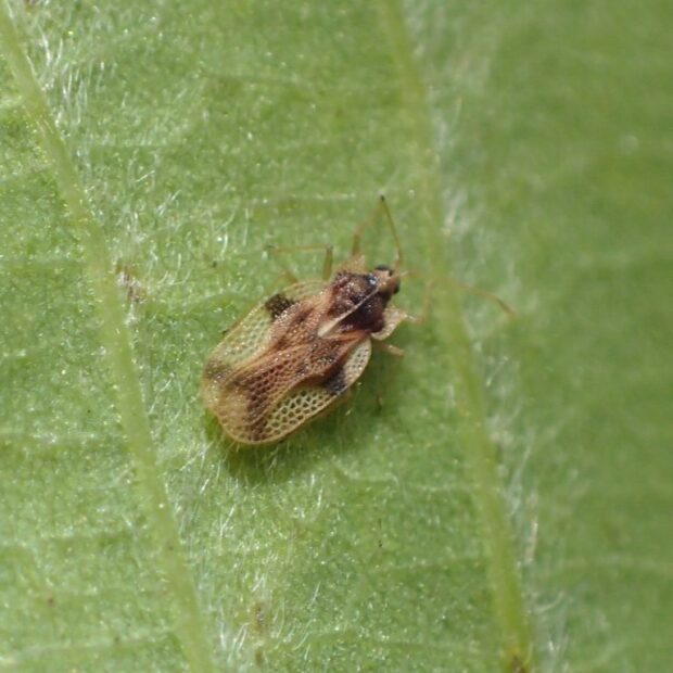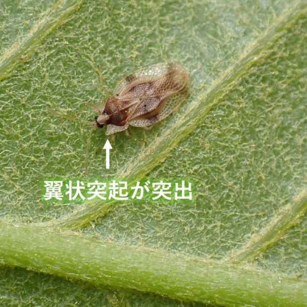 クヌギやコナラにつくグンバイムシの仲間。 ほっそりしており、 前ばねにX字状にみえる褐色の模様があります。
