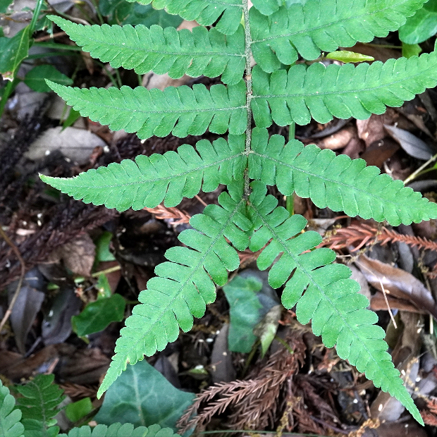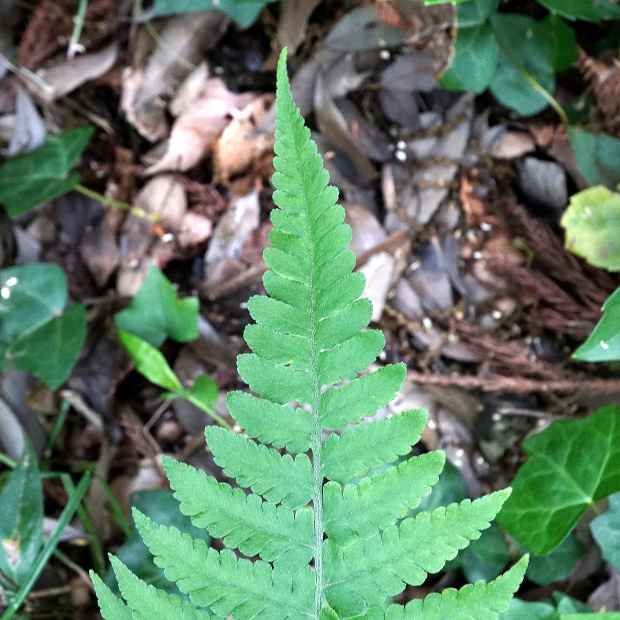 右や奥の切れ込み深い葉は別種のハシゴシダ。