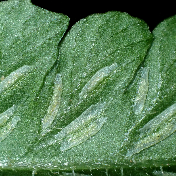 胞子のう群は楕円形で、 やや脈寄りにつく。
