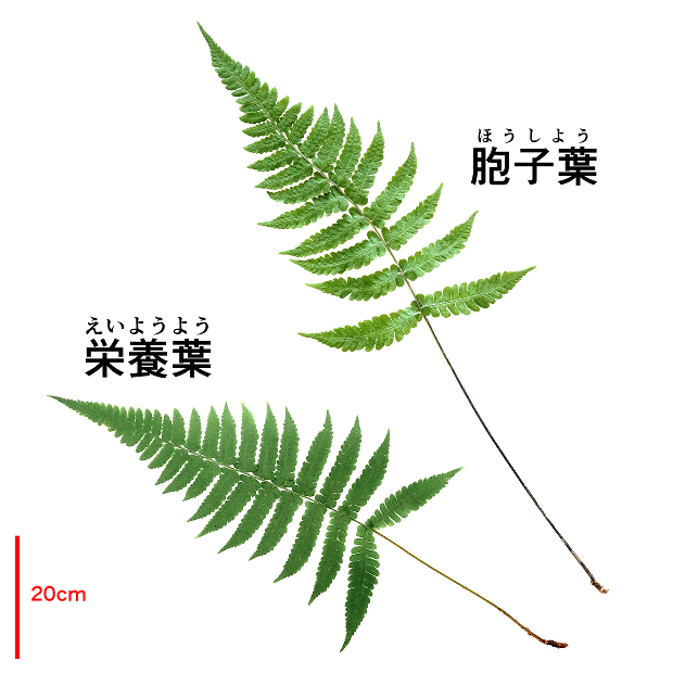 胞子葉は葉柄が長く、 羽片間のすき間がより広め。