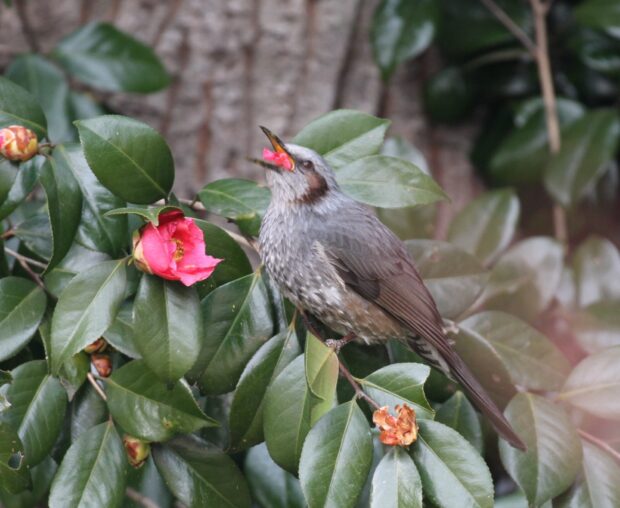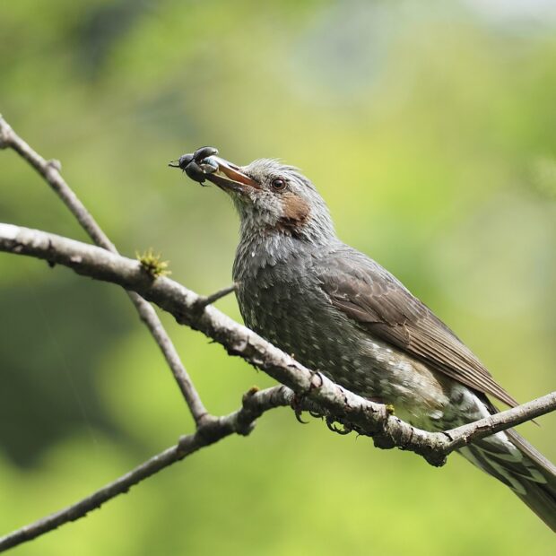 ボサボサの頭で茶色いほっぺた、 スズメより二回りほど大きい鳥。 ヒィーヨヒィーヨと鳴きます。 関東圏では一年中見られます。 木の実や果物が大好き。 休んでいる様子はお茶目です。 ぜひ観察してみてください!