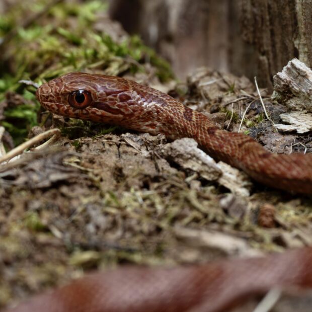 虹彩は、 橙色から赤色で鮮やかな色をしており、 アオダイショウと比べると顔の大きさに対して目が大きいためか、 顔立ちがキリッとしていて、 クールに見えます。