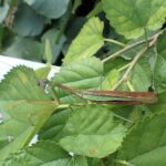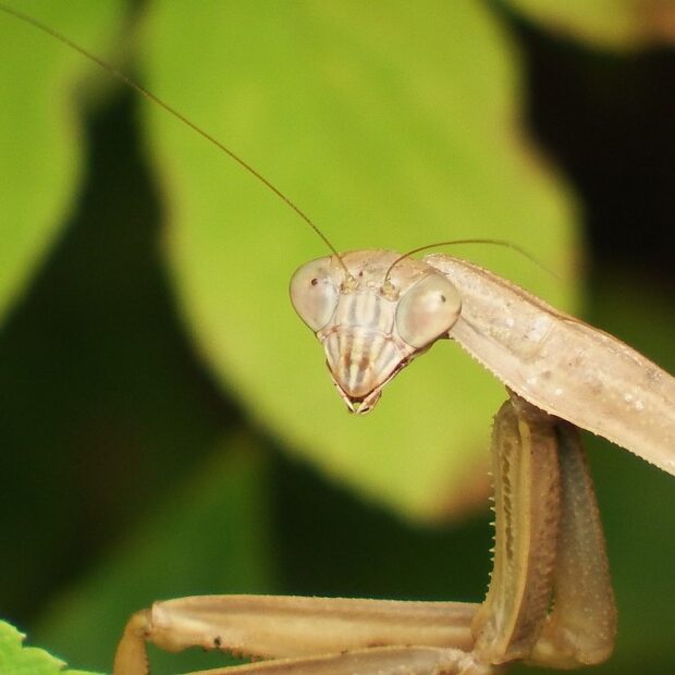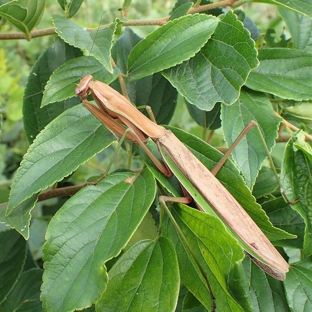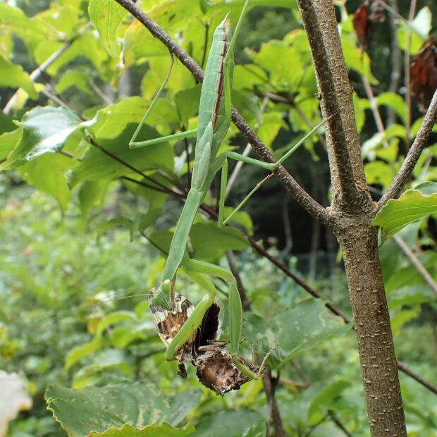 待ち伏せをして昆虫などをとらえる大型のカマキリ。 メスは秋に草の茎や低木に卵鞘(らんしょう)をつくり、 翌年の4~5月頃、 幼虫がふ化します。 街中でも見られ、 夜間活動する時は、 白い眼が黒く変化します。