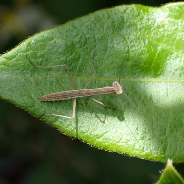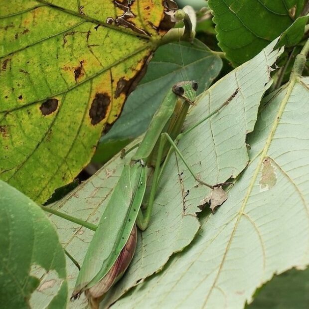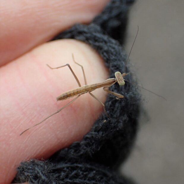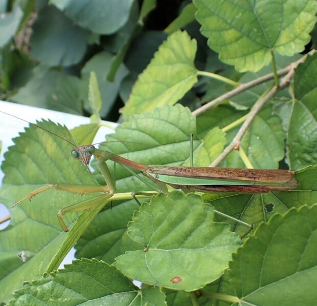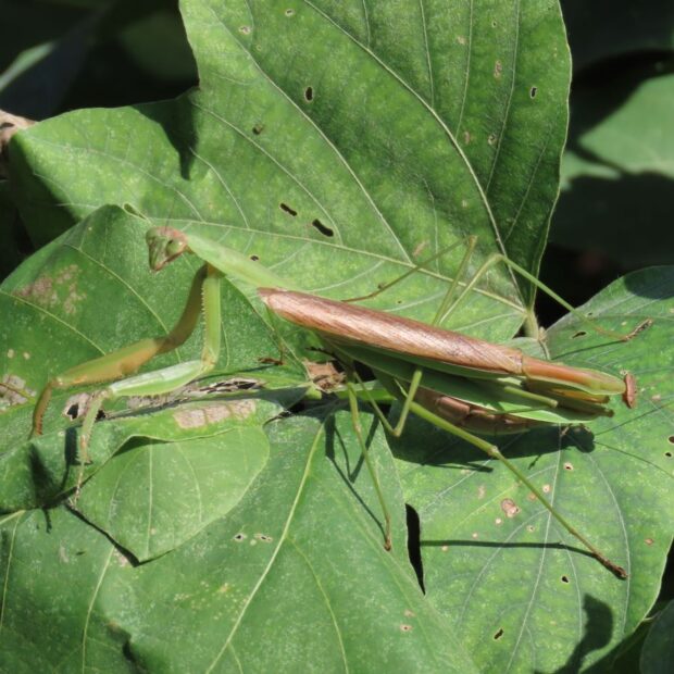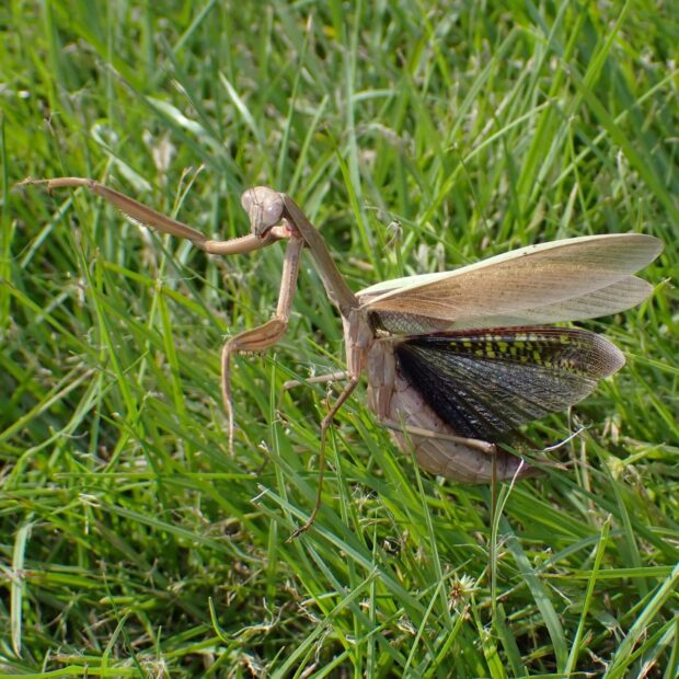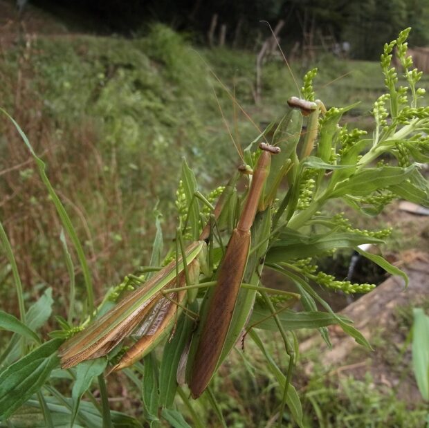 チョウセンカマキリは、 後ばねがほぼ透明で、 前あしのつけねの間がオレンジ色をしています。