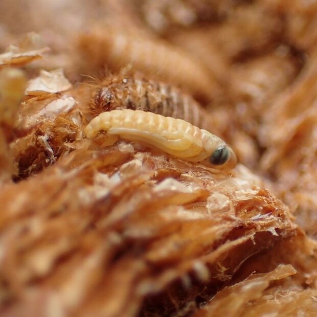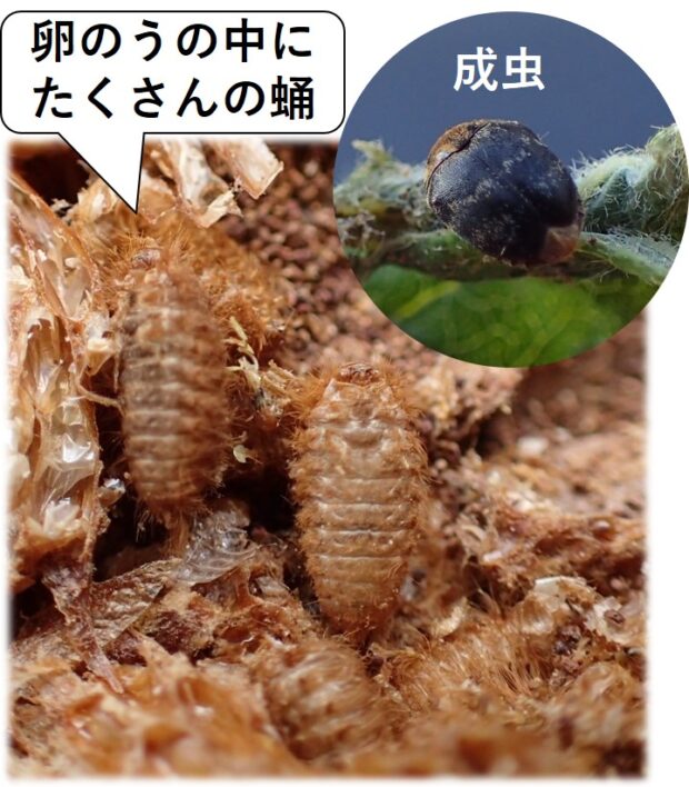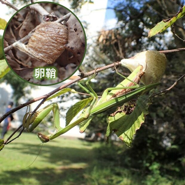 卵は鳥に食べられたり、 カマキリタマゴカツオブシムシという甲虫(体長4~5mm)に寄生されたりします。 カマキリタマゴカツオブシの幼虫はカマキリの卵を食べて成長します。